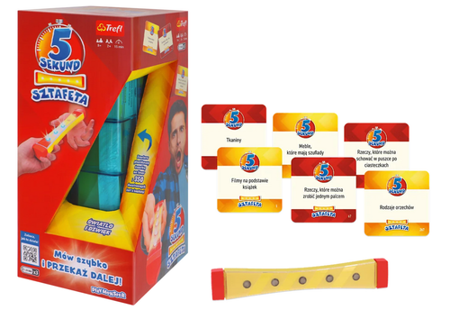 5 sekund SZTAFETA to jeszcze bardziej spontaniczna i nieprzewidywalna odsłona kultowej gry, w której szybko myślisz i szybko mówisz. Przeczytaj na głos hasło z karty, wykrzycz odpowiedzi i podaj pałeczkę wybranemu przez siebie graczowi.