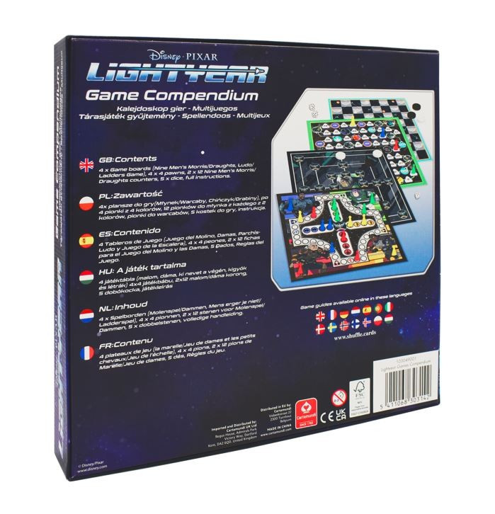 Zestaw najlepszych gier z Twoimi ulubionymi bohaterami z Lightyear i Buzzem Astralem. Zagraj na jednej z czterech plansz, bądź zostań mistrzem gry w kości! W środku znajdziesz m.in. takie gry jak: Młynek, Warcaby, Wilk i Owce, Drabiny, 10.000 lub Yatzy. Wybierz coś dla siebie i nie daj się nudzie!