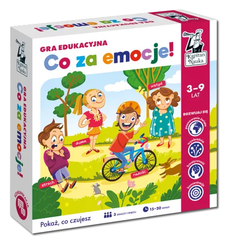 Gra edukacyjna „Co za emocje!” to kreatywna i żywiołowa gra dla młodszych dzieci, które uczą się rozpoznawać swoje i cudze uczucia oraz je wyrażać. Zadaniem gracza jest zaprezentować pozostałym uczestnikom przedstawioną na karcie emocję w określony sposób. Można to robić za pomocą min, krótkiej opowieści, dźwięków i odgłosów lub rozpoznając emocję na podstawie wyrazu twarzy. To świetny trening komunikacji, który pobudza wyobraźnię emocjonalną, kreatywność, empatię oraz umiejętność kojarzenia, a nade wszystko dostarcza dużo emocji i śmiechu! Trening rozpoznawania i wyrażania emocji! Gra edukacyjna „Co za emocje!” to doskonała pomoc dla przedszkolaków wspomagająca ich w lepszym poznaniu siebie i uczuć osób z najbliższego otoczenia. Dzięki prostym, a zarazem aktywnym wariantom gry dzieci nauczą się nazywać podstawowe emocje, takie jak: radość, smutek, zaskoczenie, wstyd czy strach. Podczas zabawy przedszkolaki będą mogły ćwiczyć wyrażanie emocji w bezpiecznej rodzinnej atmosferze oraz rozmawiać o tym, co czują w określonych sytuacjach i jak radzić sobie z radzić zarówno z pozytywnymi, jak i negatywnymi uczuciami. Wystarczy odkryć jedną z 10 kart aktywności i przekazać ją pozostały uczestnikom we wskazany na karcie sposób: za pomocą mimiki, całego ciała, własnego głosu czy wyrazu twarzy innych. Doskonała rozrywka dla całej rodziny. Realistyczne i sugestywne rysunki Katarzyny Urbaniak wprowadzają młodsze dzieci w świat emocji i pomagając je oswoić i czyniąc je przyjaźniejszymi. Karty do gry mają zaokrąglone rogi i zostały wykonane z grubej tektury, co gwarantuje bezpieczną zabawę oraz wytrzymałość. Rozwój: • poznawanie świata, • myślenie logiczne, • wyobraźnia, • koncentracja.