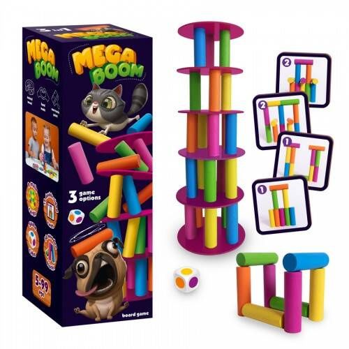 Gra rozwija umiejętność koncentracji i skupienia uwagi. Należy szybko podejmować decyzję, aby uniknąć zawalenia wieży i wywołania Mega Boom! Instrukcja zawiera dwie wersje gry, które dodają nowe wyzwania i elementy taktyczne.
