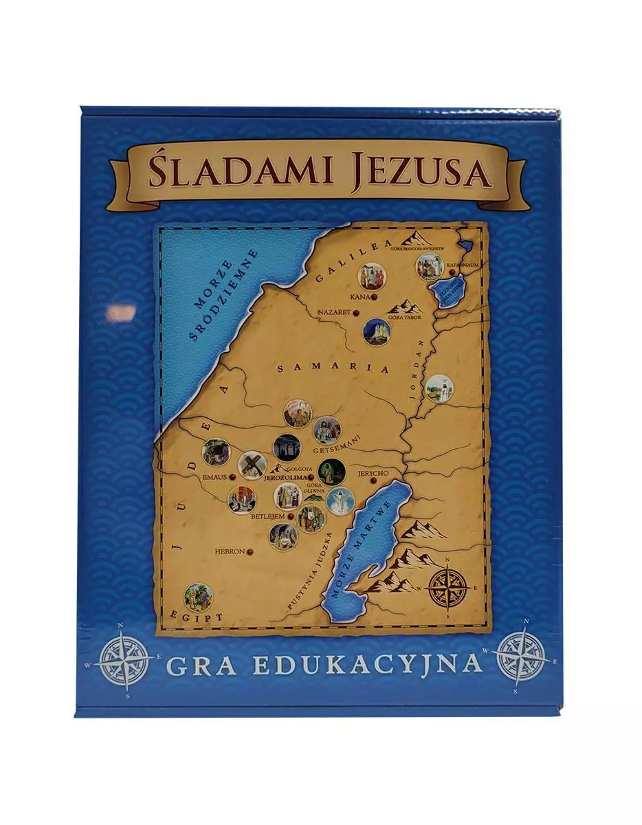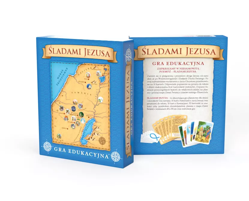 Poznaj niesamowitą grę edukacyjną – „Śladami Jezusa”! Zamień się w pielgrzyma i przemierz drogę Jezusa od narodzin aż po Wniebowstąpienie i Zesłanie Ducha Świętego. Poznaj najważniejsze wydarzenia z życia Chrystusa przedstawione na 16 kartach. Odpowiedz poprawnie na pytania do tekstu i zbierz maksymalną ilość kartoników (żetonów). Dopasuj ilustracje poszczególnych historii do właściwych miejsc na planszy i poznaj mapę Ziemi Świętej z czasów naszego Zbawiciela. Zawartość opakowania: • 16 kart z historiami z życia Jezusa oraz pytaniami do tekstu, • 16 kart z ilustracjami, • 32 kartoniki ze znakami ryby (symbolem chrześcijaństwa), • plansza z mapą Ziemi Świętej o wymiarach 48.0 x 39.0 cm, • instrukcja gry.