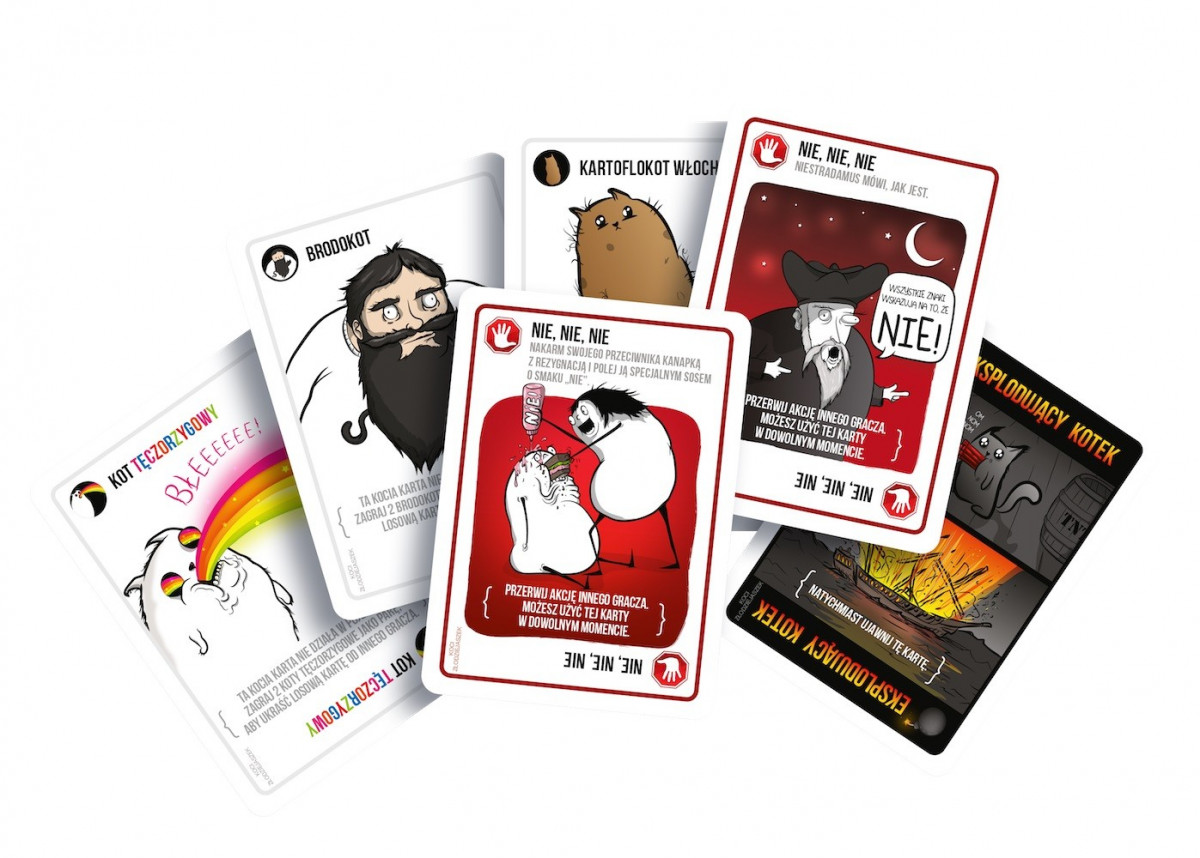 Eksplodujące Kotki to napędzana kociakami, całkowicie bezpieczna odmiana rosyjskiej ruletki. Podczas rozgrywek gracze co turę dobierają po jednej karcie, aż do momentu, gdy ktoś wyciągnie eksplodującego kotka taki nieszczęśnik wybucha i ginie, a tym samym kończy grę. Na szczęście w talii są też karty, dzięki którym możemy odwlekać nieuniknione (a raczej przerzucić je prosto na przeciwników). Aby wygrać, musimy mądrze zarządzać kartami, które uda nam się zdobyć.