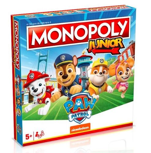 MONOPOLY Junior Psi Patrol Psi Patrol rusza do akcji! Odważne pieski zjawiają się wszędzie tam, gdzie są potrzebne: Chase, Marshall, Rubble, Rocky, Skye, Zuma, Everest, Tracker, a na ich czele Ryder Zack, który zajmuje się szkoleniem dzielnej załogi. Wspólnie przemierzymy zakątki znane z Psiego Patrolu, takie jak: Most w Zatoce Przygód, Wyspa Fok, Ratusz, czy Baza. Na graczy czekają specjalne karty Misja, które kryją wiele niespodzianek. Po planszy będziecie mogli poruszać się specjalnymi pionkami, na których widnieją pieski, należące do załogi! Wybierzcie swojego ulubieńca i dajcie się ponieść dzisiejszej misji. Z Psim Patrolem na pewno dacie radę ją wykonać!