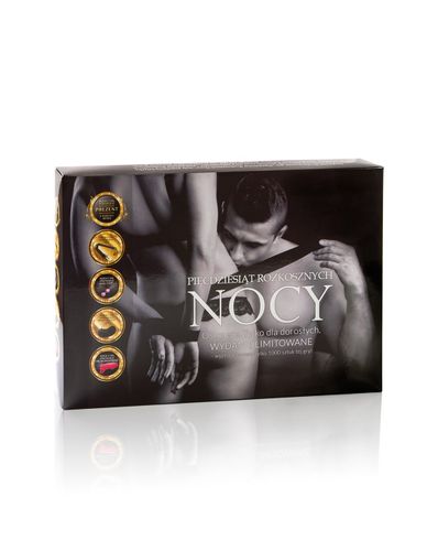 „Kiedy wszedł do sypialni, stałam jak sparaliżowana. Czułam w sobie mieszankę lęku i dzikiego pożądania na myśl o tym, co zaraz wydarzy się między nami. Mały pejcz, który leżał na pościeli był zapowiedzią nowej przygody, ale także... Myśli zaczęły uciekać, kiedy poczułam, jak obejmuje moje dłonie i związuje zimną liną, zakłada opaskę na oczy... na swoich pośladkach czułam twardy dotyk jego męskości... czułam, że już jest gotowy, by wejść … ale to był dopiero początek naszej przygody...” Chcesz doświadczyć takich emocji? Chcecie razem wybrać się w erotyczną podróż do krainy Christiana? Pejcz, kulki gejszy, związane dłonie i stopy... pieszczoty z dużą szczyptą pikantności - to wszystko czeka na Was zamknięte w tym opakowaniu. Jeżeli zawsze chciałaś spróbować, ale nie wiedziałaś jak zacząć... Jeżeli zawsze liczyłeś na bardziej pikantny seks między Wami...kup „Pięćdziesiąt rozkosznych nocy” i doświadczaj nowych emocji w sypialni. To najbardziej pikantna gra w Polsce. Inspiracją do stworzenia gry „Pięćdziesiąt rozkosznych nocy” była popularna książka, opowiadająca historię fascynacji przemilczaną sferą seksualności. „Pięćdziesiąt rozkosznych nocy” to lekkie potraktowanie tematów Bondage czy SM, nie przekraczające pewnych granic. Zagrajcie w „Pięćdziesiąt rozkosznych nocy”, a dowiecie się dlaczego będzie to jedna z najlepiej sprzedających się polskich gier erotycznych najbliższych lat.