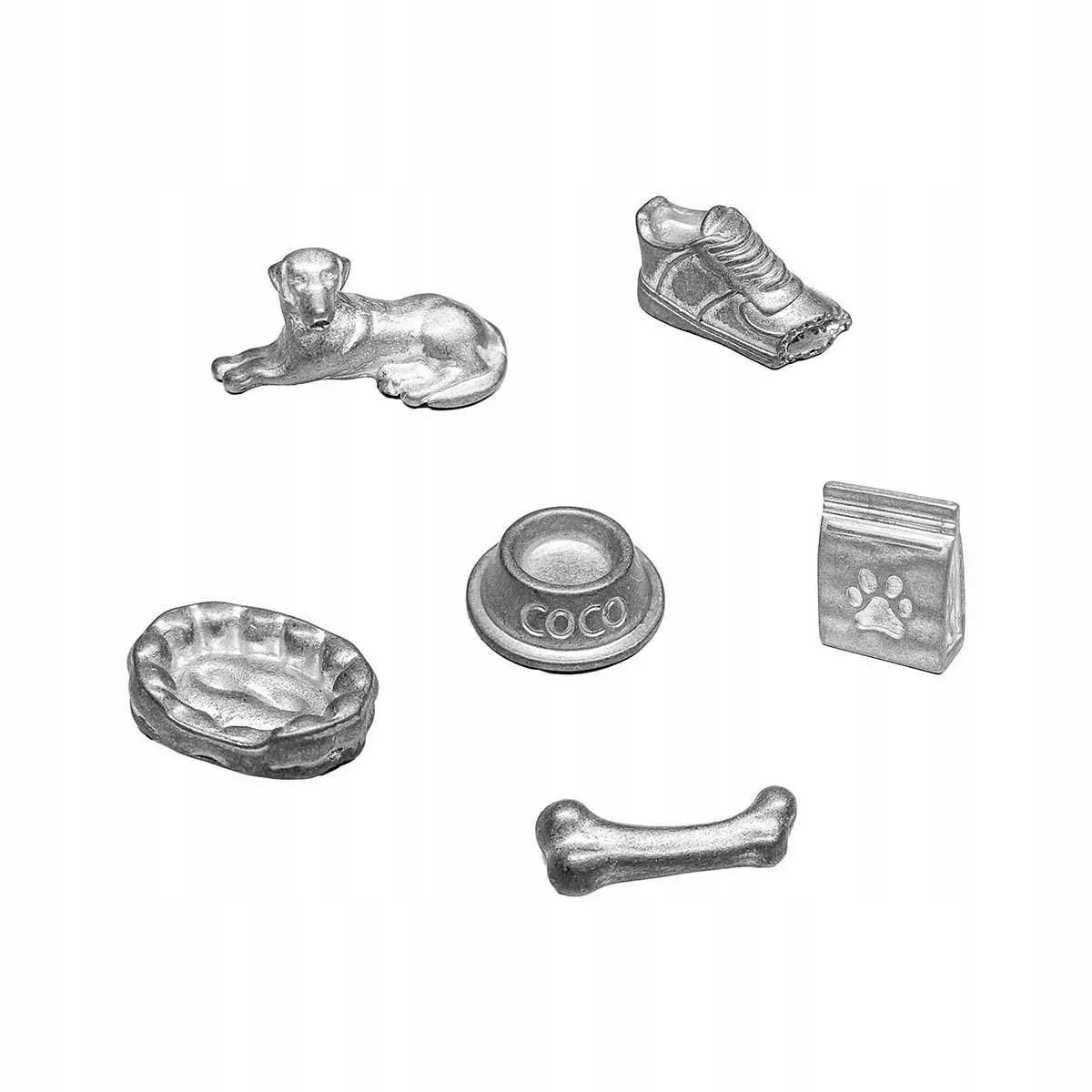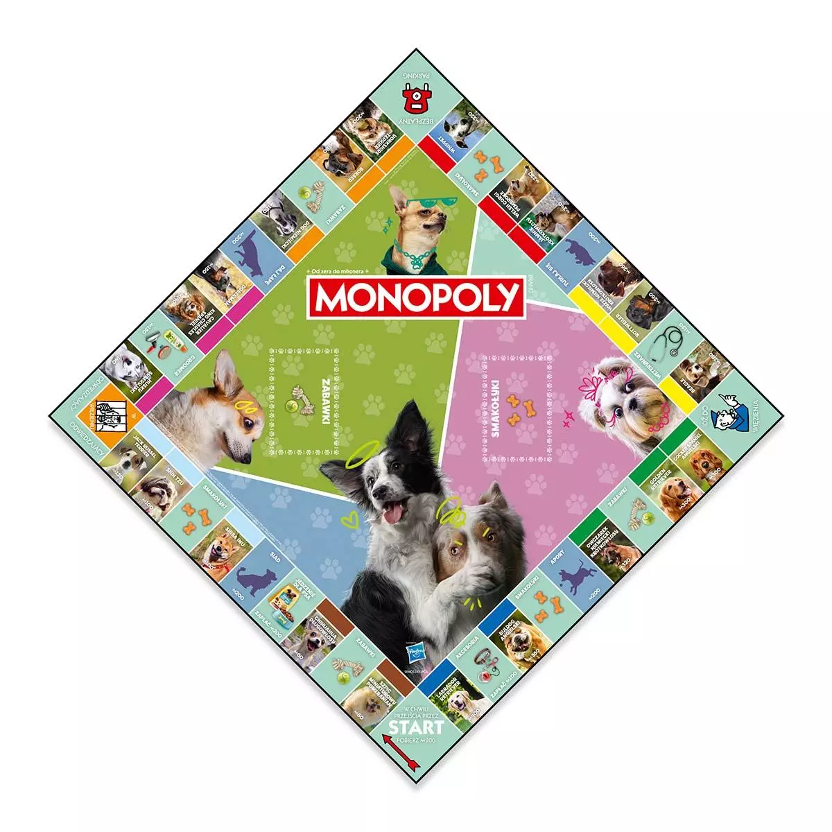 MONOPOLY PSY – Przygoda w świecie czworonożnych przyjaciół! Psy to wierni towarzysze i najlepsi przyjaciele człowieka, którzy zasługują na swoją wyjątkową edycję MONOPOLY! Jeśli kochasz czworonogi, ta gra jest właśnie dla Ciebie. Wybierz jeden z kolekcjonerskich pionków – kość, miskę, smaczki, pieska, pogryziony but lub legowisko – i ruszaj na przygodę w świecie naszych przyjaciół. Kupuj psie domki i hotele, odwiedzaj weterynarza i groomera, sięgaj po karty „Zabawek” lub „Smakołyków” i spróbuj zostać najlepszym psim opiekunem! Owczarek niemiecki, chihuahua, husky syberyjski – to tylko niektóre z ras, które możesz zdobyć. Czy uda Ci się zdominować planszę i pokonać przeciwników? Zasady gry Każdy gracz wybiera pionek i otrzymuje banknoty w różnych nominałach. Grę rozpoczyna osoba, która wyrzuci najwyższą liczbę oczek na kostce. Celem jest zdobycie jak największej fortuny poprzez zakup i rozwój psich lokalizacji. Pamiętaj, że jeśli wejdziesz na pole należące do innego gracza, będziesz musiał zapłacić. Zwycięża ten, kto jako ostatni pozostanie na planszy z pieniędzmi, doprowadzając innych do bankructwa. Zawartość pudełka: Plansza do gry, 6 kolekcjonerskich pionków, 28 kart Tytuł Własności, 16 kart Zabawki, 16 kart Smakołyki, Zestaw banknotów Monopoly, 2 kostki, 32 domki, 12 hoteli, Instrukcja. Specyfikacja: Liczba graczy: 2-6, Wiek: 8+, Czas gry: 1-3 godziny, Język wydania: polski. Uwaga! Produkt nieodpowiedni dla dzieci poniżej 3. roku życia.