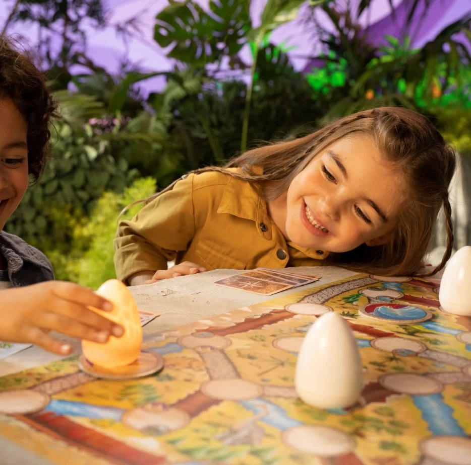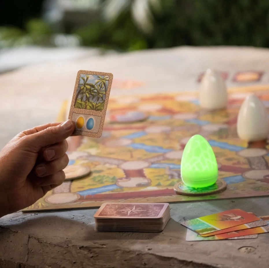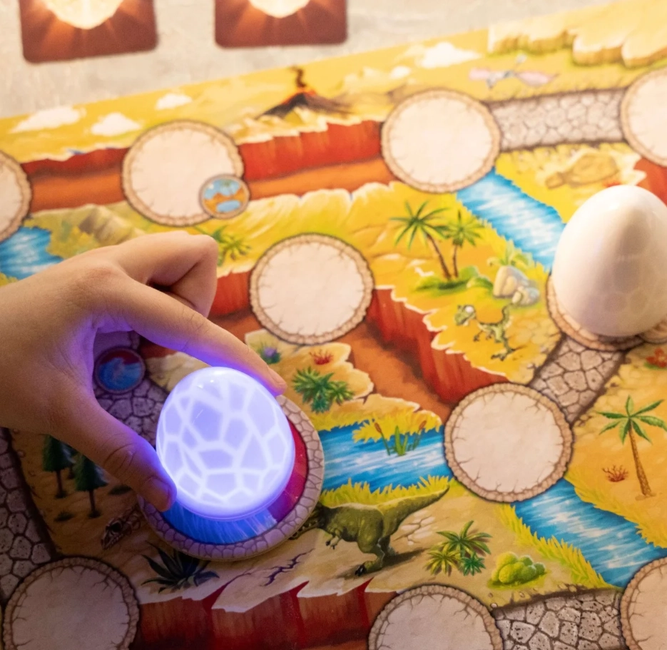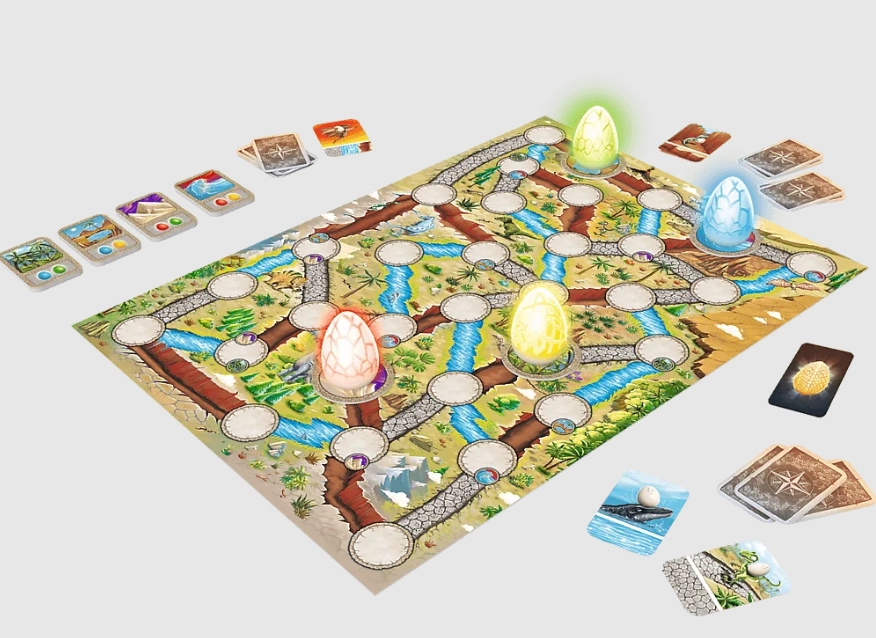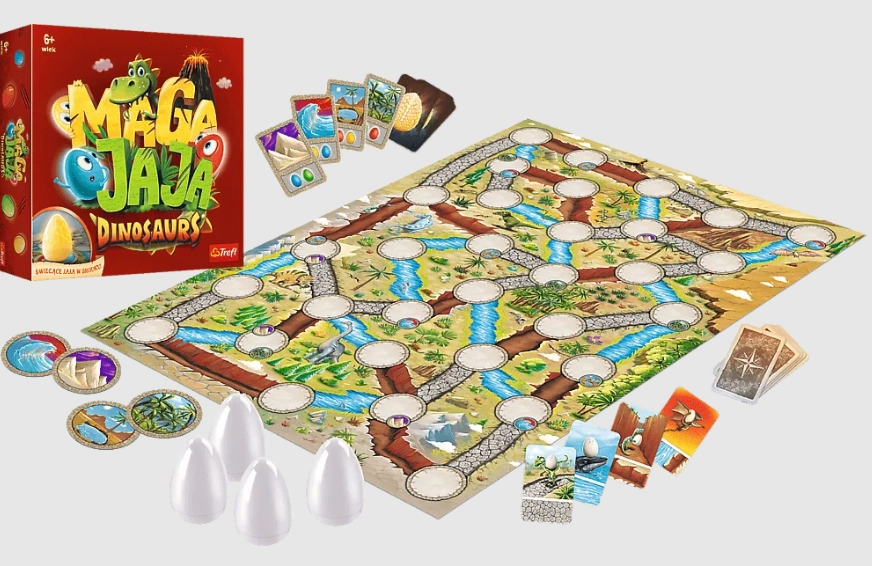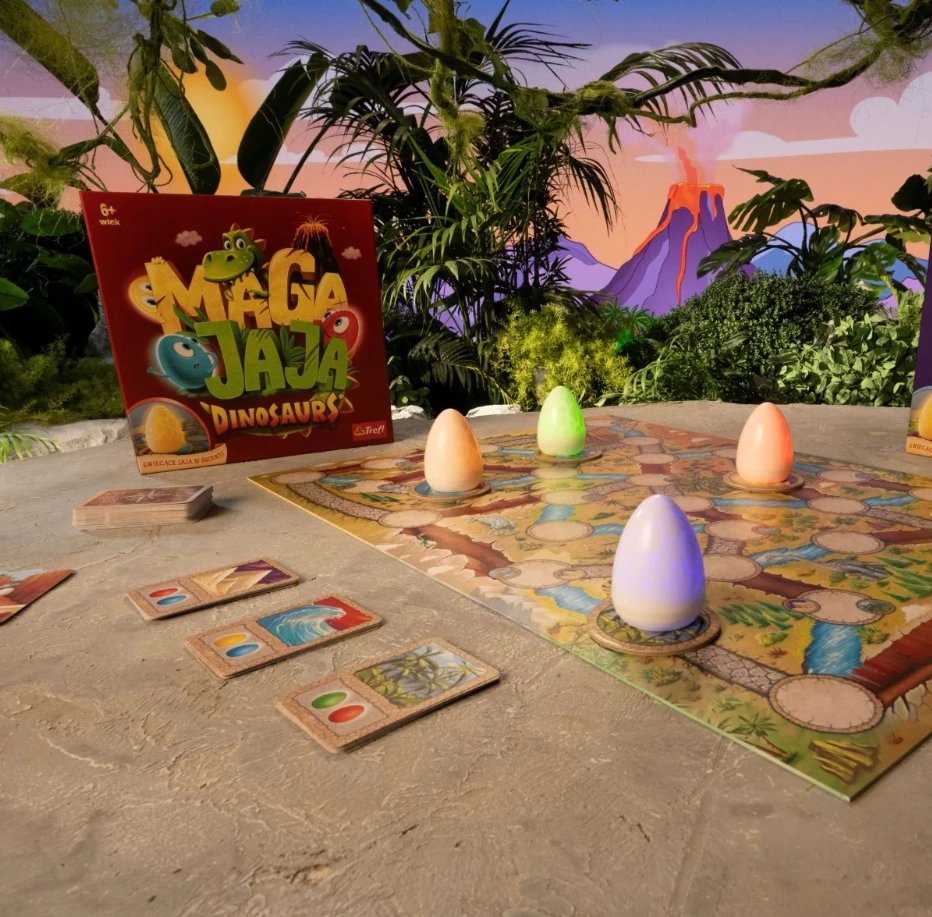 Magajaja poszukują drogi do swoich krain! Czy pomożecie im dotrzeć na miejsce? Gracze zagrywają karty i przesuwają jajka po prehistorycznym świecie dinozaurów. Kiedy dotrzecie do jednej z krain, jajka pokażą prawdziwe oblicza i zaświecą unikatowymi kolorami. Czy zdołacie zapamiętać ich położenie i doprowadzić do odpowiednich miejsc? Jeśli Wam się to uda, otrzymacie nagrodę – kartę Legendarnego Jajka. Uczestnik, który jako pierwszy zdobędzie 5 takich kart, wygrywa! Zawartość opakowania: • karty zadań, • karty ruchu, • 4 świecące jajka, • 4 żetony krain, • plansza, • instrukcja.