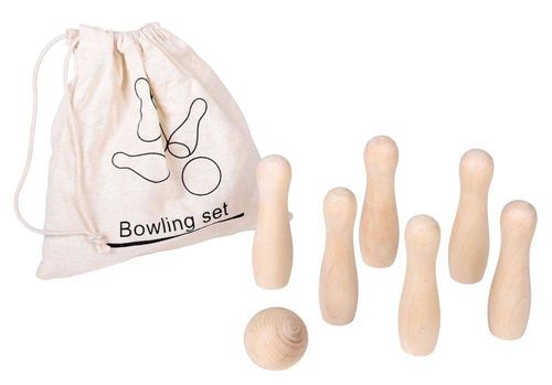 6 drewnianych kręgli i 1 kula w ekologicznej, bawełnianej torbie.