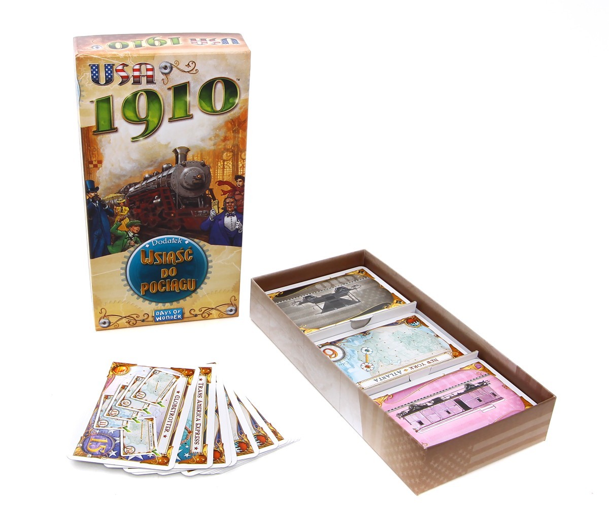 Dodatek Wsiąść do Pociągu: USA 1910 zawiera 181 kart, tym razem w większym rozmiarze znanym z innych gier tej serii! Gracze będą mieć do dyspozycji 39 zupełnie nowych kart biletów oraz dodtkową kartę bonusową Globtrotera punktującą za największą liczbę zrealizowanych biletów.