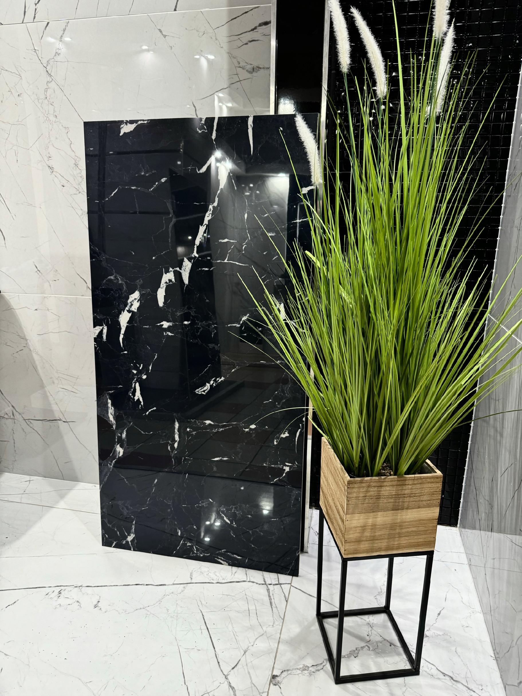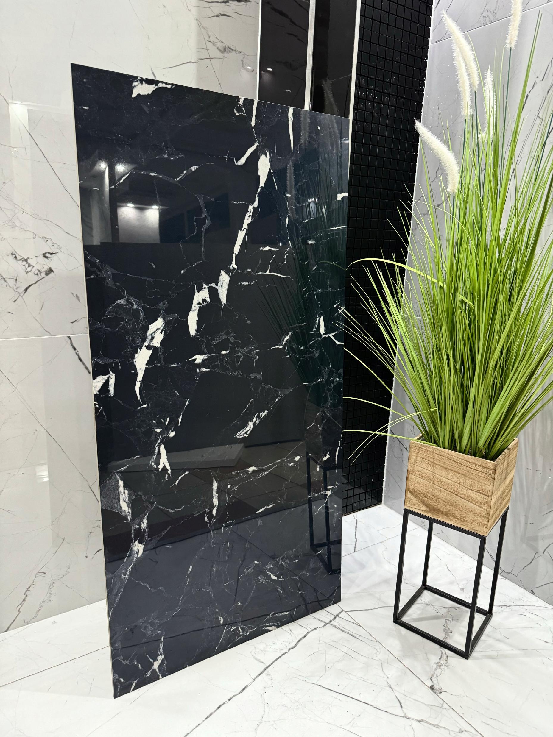Ekskluzywna płyta gresowa inspirowana czarnym marmurem to kwintesencja elegancji i nowoczesnego stylu. Lustrzana powierzchnia z delikatną głębią koloru oraz naturalne, białe użylenie tworzą wyjątkowy efekt szlachetnego kamienia. Subtelne refleksy i gra światła podkreślają głębię czerni, nadając wnętrzu wrażenie luksusu i przestronności.