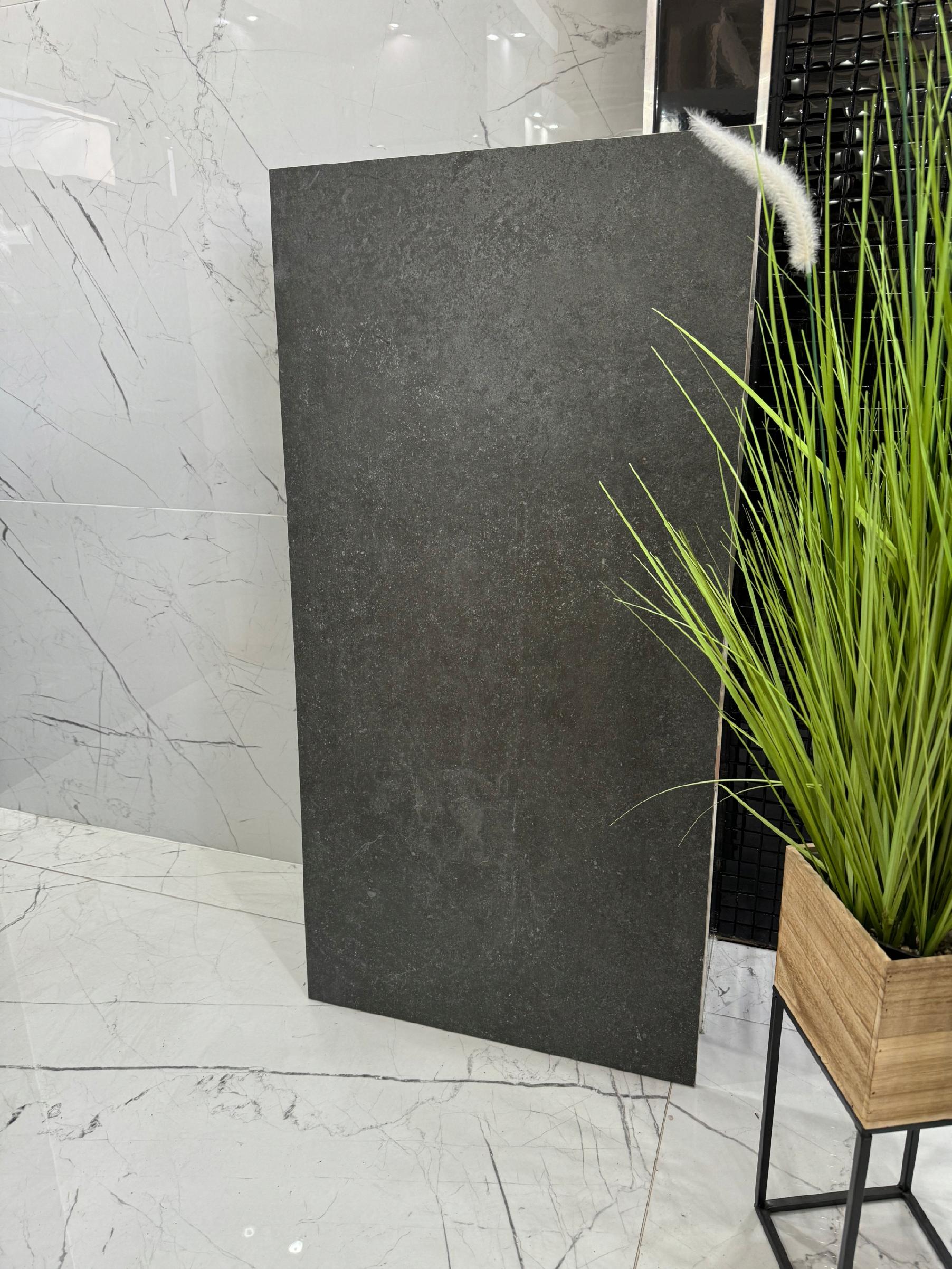 Nowoczesny gres wielkoformatowy w eleganckim odcieniu grafitu doskonale imituje naturalny kamień. Subtelna struktura i matowe wykończenie nadają powierzchni głębi oraz surowego, naturalnego charakteru.