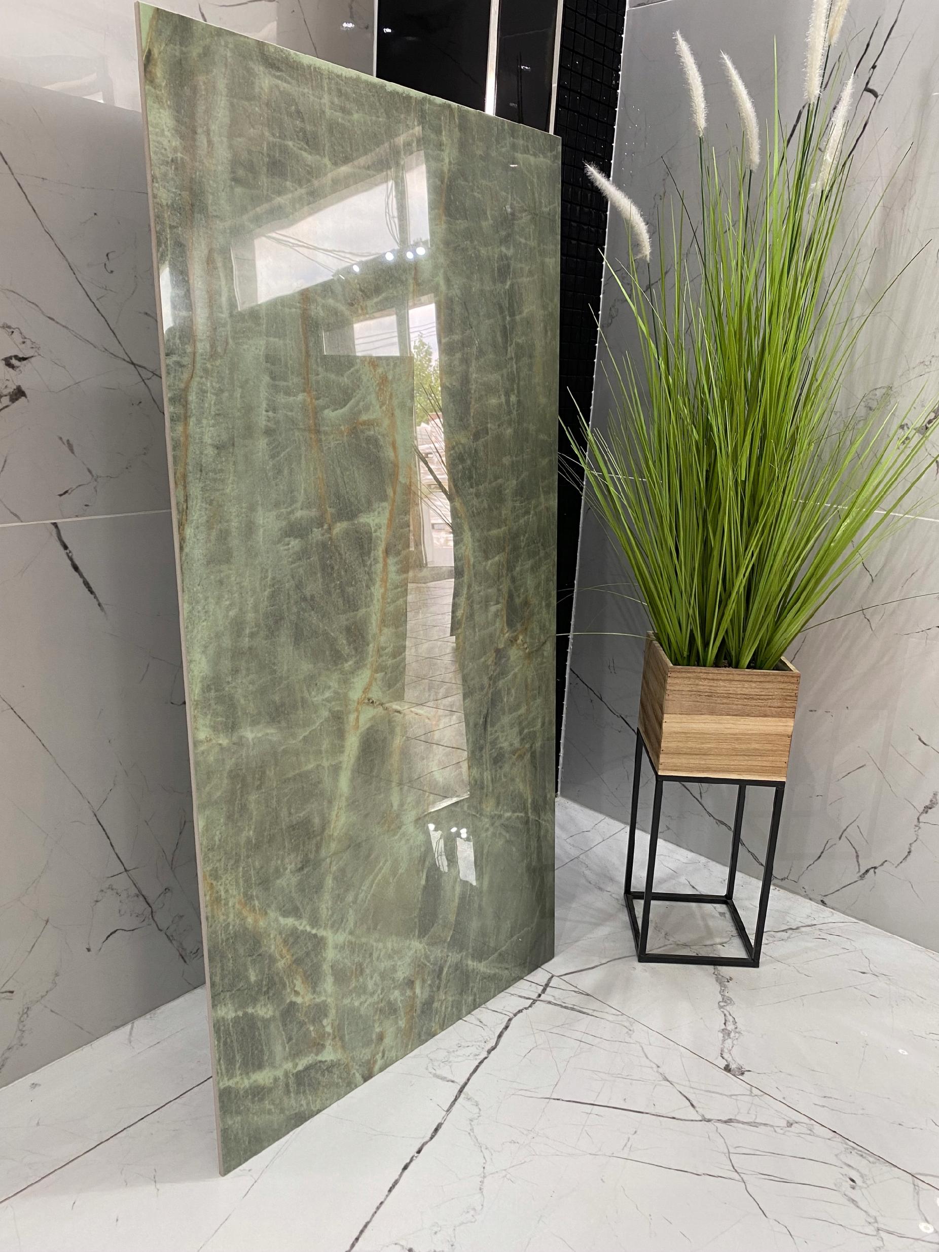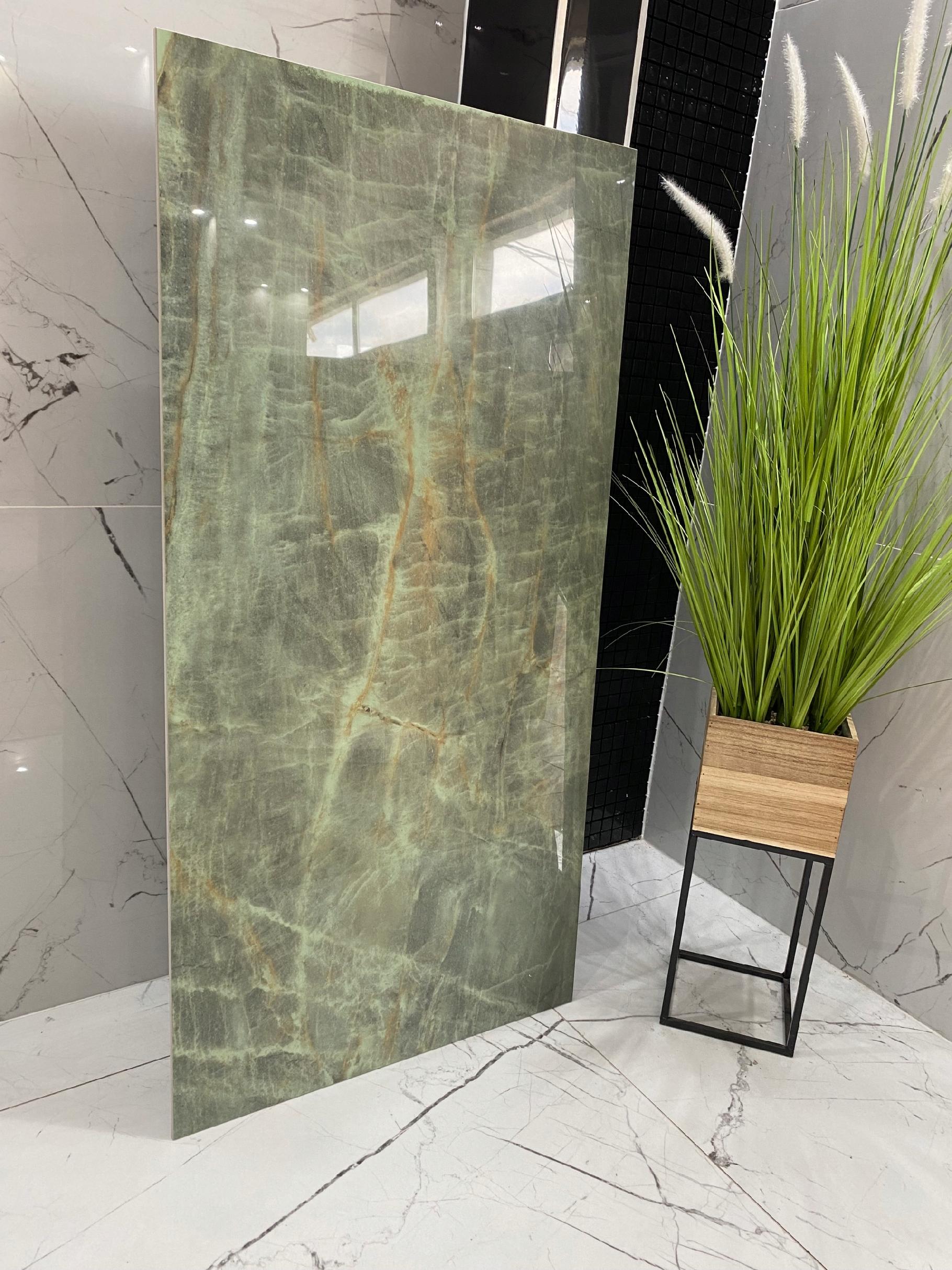 Luksusowa płytka gresowa w kolorze zielonego onyksu z eleganckimi, miodowymi żyłami.