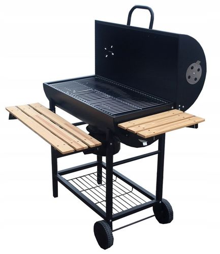 Praktyczne kółka i uchwyt boczny sprawiają, że grill jest łatwy do ustawienia i przemieszczania. Dodatkowo, zestaw obejmuje dwie składane drewniane półki i jedną drucianą, umożliwiające wygodną organizację przestrzeni roboczej.