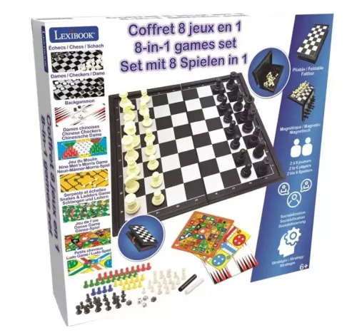 Magnetyczna wersja 8 ponadczsowych gier planszowych! 8 gier w zestawie: szachy, warcaby, młynek, węże i drabiny, gra w gęsi, ludo, chińskie warcaby i tryktrak. Silny magnes pozwala przyczepić każdy element do magnetycznej planszy. Doskonała przyczepność pozwala utrzymać pozycję pionków w przypadku konieczności przesunięcia planszy lub w przypadku ruchu stołu. Plansza składa się. Wygodna do przechowywania lub zabrania jej w podróż!