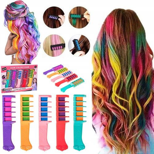 Zestaw zawiera 5 grzebieni z kredą farbującą. Wystarczy kilka sekund, żeby włosy nabrały nowych barw i stały się niepowtarzalne.