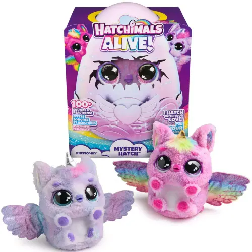 Hatchimale nie mogą wykluć się same – to TY jesteś kluczem do wyzwolenia tej magii! Hatchimals to magiczne stworki żyjące wewnątrz jaj. Co się znajduje w środku? To niespodzianka! Każde jajko zawiera jednego z dwóch możliwych do znalezienia interaktywnych stworków Hatchimals. Pokochaj i zaopiekuj się swoim jajkiem! Odkryj magię z Hatchimals Alive Mystery Hatch! Te wyjątkowe jajka-niespodzianki potrzebują Twojej miłości, aby się wykluć. Z ponad 100 dźwiękami i reakcjami, efektami świetlnymi oraz magiczną mgiełką, te Hatchimals to absolutny hit. Kogo wyklujesz? To niespodzianka! W każdym jajku ukryty jest jeden z dwóch unikalnych bohaterów. Aby pomóc swojemu Hatchimalowi wykluć się, przytulaj, stukaj, unoś i kołysz jajko – reaguje ono na Twoją troskę, świeci i porusza się! Kiedy Twoje jajko będzie gotowe, poczuj ekscytację, gdy tajemnicza mgiełka i tęczowe światła zwiastują moment wyklucia. Po wykluciu Twój nowy przyjaciel będzie gotowy do zabawy, inspirując do niezapomnianej, kreatywnej rozrywki.
