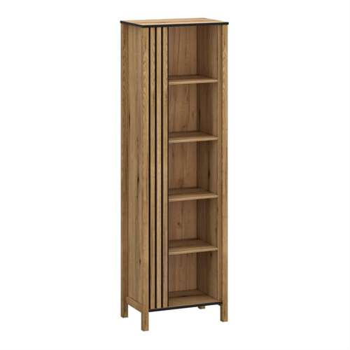 Niepowtarzalny deseń dąb evok z wyraźnym dekorem ciemnych sęków. Subtelne ryfle, które dodają meblom atrakcyjności. Czarne uchwyty zostały idealnie wpasowane w brzegi frontów tak, że stają się niemal niezauważalne. Ciekawe i praktyczne zastosowanie otwartych półek w szafce RTV, komodzie oraz regale.