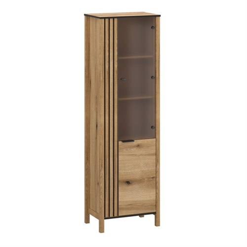 Niepowtarzalny deseń dąb evok z wyraźnym dekorem ciemnych sęków. Subtelne ryfle, które dodają meblom atrakcyjności. Czarne uchwyty zostały idealnie wpasowane w brzegi frontów tak, że stają się niemal niezauważalne. Ciekawe i praktyczne zastosowanie otwartych półek w szafce RTV, komodzie oraz regale.