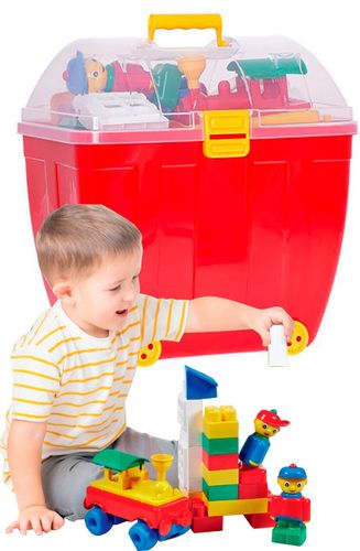 Kuferek, w pięknym czerwonym kolorze, ułatwia przechowywanie wszystkich elementów w jednym miejscu, co sprawia, że zabawa jest praktyczna i poręczna. Po skończonej zabawie, dzieci mogą łatwo schować wszystkie klocki do kuferka, aby zachować porządek.