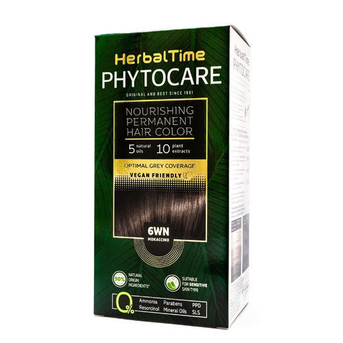 📦✨ Herbal Time Phytocare – Naturalna, trwała farba do włosów 6WN Mokaccino Ciepły, głęboki odcień mokka z naturalnym połyskiem – bez amoniaku, z ekstraktami roślinnymi i olejkami, dla trwałego koloru i zdrowych włosów.