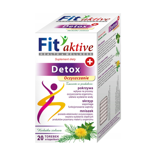 FIT AKTIVE DETOX to naturalne wsparcie procesów oczyszczania organizmu. Starannie dobrana mieszanka ziół na bazie zielonej herbaty pomaga usuwać nadmiar wody oraz zbędne produkty przemiany materii, przywracając lekkość i dobre samopoczucie.