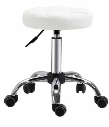 Posiada miękkie i obrotowe siedzisko obite ekoskórą oraz stabilną podstawę z pięcioma obrotowymi kółkami, które nie rysują podłogi.