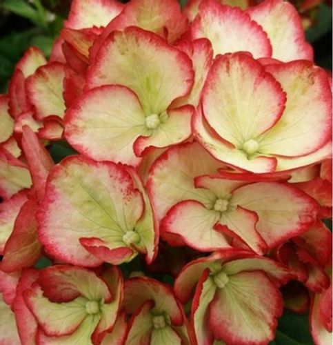 Hydrangea macrophylla Magical Flamenco to piękna odmiana o plisowanych, białych, pikowanych kwiatach na czubkach z czerwonymi brzegami latem od czerwca do września.