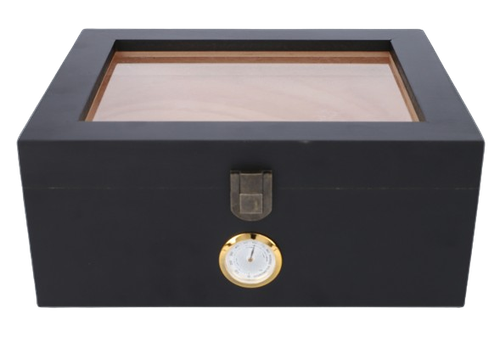 Elegancki humidor wykonany z drewna sosnowego łączy klasyczny wygląd z praktycznymi rozwiązaniami. Przeszklona pokrywa pozwala podglądać zawartość, a wbudowany higrometr na froncie ułatwia kontrolę wilgotności. Solidny korpus i metalowy zatrzask dbają o stabilny mikroklimat dla cygar.