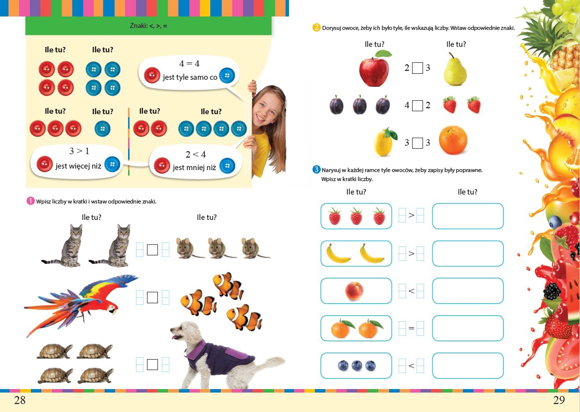 Z badań przeprowadzonych przez prof. Edytę Gruszczyk-Kolczyńską wynika, że ponad połowa polskich dzieci na styku przedszkole – szkoła jest uzdolniona matematycznie, a co czwarte dziecko – wybitnie! Jak nie stracić tego potencjału? Jak wesprzeć rozwój zdolności matematycznych dzieci u progu klasy pierwszej? Tylko z Elementarzem matematycznym! Elementarz matematyczny to książka wprowadzająca dzieci w podstawowe pojęcia matematyczne. Dzieci uczą się m.in. klasyfikacji, rytmów, orientacji w przestrzeni i na płaszczyźnie, poznają cechy wielkościowe, pojęcie liczby naturalnej, monografię liczb, rozwiązują zadania tekstowe, zapoznają się z działaniami: dodawaniem i odejmowaniem, pieniędzmi i obliczeniami pieniężnymi, dniami tygodnia, miesiącami, zegarem, mierzą długości i obliczają ciężar oraz pojemność, utrwalają znajomość figur geometrycznych i symetrię. Całość zagadnień jest uporządkowana metodycznie i ułożona zgodnie z zasadą stopniowania trudności. • Zadania w książce są w formie łamigłówek i różnorodnych ćwiczeń aktywizujących odnoszących się do codziennych doświadczeń dzieci. Dziecko widzi sensowność wykonywanych ćwiczeń i ma sporą dawkę motywacji do ich rozwiązania. • Do elementarza dołączony jest zestaw kostek: 2 tradycyjne kostki z oczkami 1–6 i 2 dziesięciościenne kostki z cyframi 0–9. Kostki wykorzystuje się m.in. do gier matematycznych, które znajdują się w książce. Każda gra jest poświęcona innemu zagadnieniu matematycznemu i w formie fantastycznej zabawy rozwija różnorodne umiejętności: myślenie logiczne, analityczne i strategiczne myślenie, kojarzenie faktów, szybkie podejmowanie decyzji, przewidywanie następstw podejmowanych decyzji, koncentrację i pewność siebie. • Elementarz zawiera też kilkadziesiąt naklejek – to świetna zachęta do rozwiązywania ćwiczeń. • Na końcu książki znajduje się wycinanka z elementami, które dzieci wycinają i wykorzystują do rozwiązania zadań. Oprócz doskonalenia konkretnych umiejętności matematycznych dzieci ćwiczą motorykę małą, skupienie i uczą się organizacji pracy.