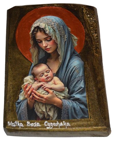 Współczesna ikona na drewnie o wymiarach ok.15 cm x 21,5 cm x 2,5 cm, . Ikona zabezpieczona lakierem i werniksem szelakowym w połączeniu własnej metody transferu na japońskim papierze umożliwia uzyskanie ciekawego efektu nanoszenia obrazu. Widoczne spękania, nierówności, wgłębienia, są zamierzone i celowe z tyłu zawieszka do powieszenia.Na życzenie dedykacja umieszczona na odwrocie reliefem wypukłym gratis