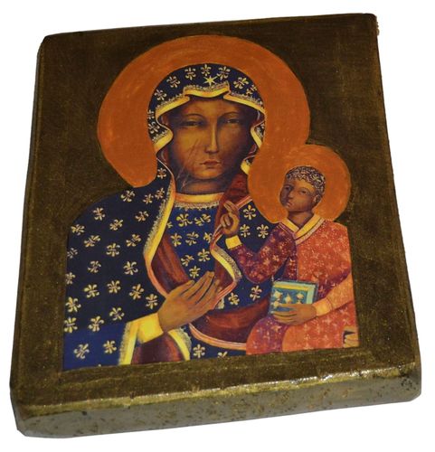 Współczesna ikona na drewnie o wymiarach ok.18,5 cm x 22,5 cm x 2,5 cm, . Ikona zabezpieczona lakierem i werniksem szelakowym w połączeniu własnej metody transferu na japońskim papierze umożliwia uzyskanie ciekawego efektu nanoszenia obrazu. Widoczne spękania, nierówności, wgłębienia, są zamierzone i celowe z tyłu zawieszka do powieszenia.Na życzenie dedykacja umieszczona na odwrocie reliefem wypukłym gratis.