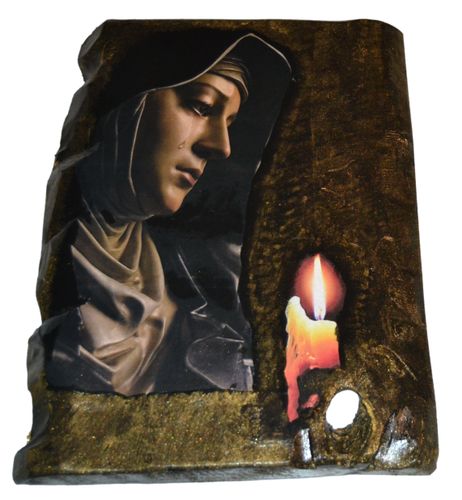 Współczesna ikona na drewnie o wymiarach ok.33 cm x 24 cm x 3 cm, . Ikona zabezpieczona lakierem i werniksem szelakowym w połączeniu własnej metody transferu na japońskim papierze umożliwia uzyskanie ciekawego efektu nanoszenia obrazu. Widoczne spękania, nierówności, wgłębienia, są zamierzone i celowe z tyłu zawieszka do powieszenia.Na życzenie dedykacja umieszczona na odwrocie reliefem wypukłym gratis.