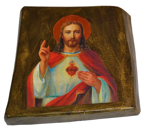 Współczesna ikona na drewnie o wymiarach ok 19 cm x 19 cm x 2,5 cm, . Ikona zabezpieczona lakierem i werniksem szelakowym w połączeniu własnej metody transferu na japońskim papierze umożliwia uzyskanie ciekawego efektu nanoszenia obrazu. Widoczne spękania, nierówności, wgłębienia, są zamierzone i celowe z tyłu zawieszka do powieszenia.Na życzenie dedykacja umieszczona na odwrocie reliefem wypukłym gratis.