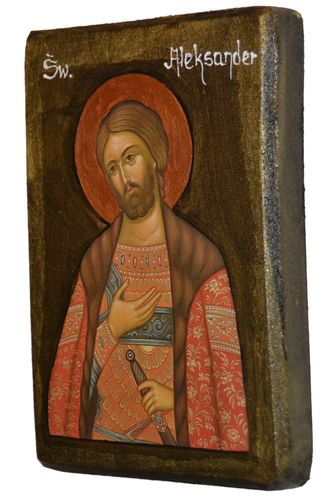 Współczesna ikona na drewnie o wymiarach ok.14,5 cm x 21,5 cm x 2,5 cm, . Ikona zabezpieczona lakierem i werniksem szelakowym w połączeniu własnej metody transferu na japońskim papierze umożliwia uzyskanie ciekawego efektu nanoszenia obrazu. Widoczne spękania, nierówności, wgłębienia, są zamierzone i celowe z tyłu zawieszka do powieszenia.Na życzenie dedykacja umieszczona na odwrocie reliefem wypukłym gratis.