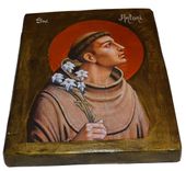 Współczesna ikona na drewnie o wymiarach ok.30 cm x 25,5 cm x 2, cm, . Ikona zabezpieczona lakierem i werniksem szelakowym w połączeniu własnej metody transferu na japońskim papierze umożliwia uzyskanie ciekawego efektu nanoszenia obrazu. Widoczne spękania, nierówności, wgłębienia, są zamierzone i celowe z tyłu zawieszka do powieszenia.Na życzenie dedykacja umieszczona na odwrocie reliefem wypukłym gratis.