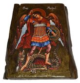 Współczesna ikona na drewnie o wymiarach ok.32,5 cm x 25 cm x 2 cm, . Ikona zabezpieczona lakierem i werniksem szelakowym w połączeniu własnej metody transferu na japońskim papierze umożliwia uzyskanie ciekawego efektu nanoszenia obrazu. Widoczne spękania, nierówności, wgłębienia, są zamierzone i celowe z tyłu zawieszka do powieszenia.Na życzenie dedykacja umieszczona na odwrocie reliefem wypukłym gratis.