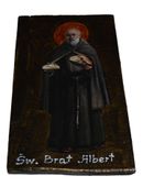 Współczesna ikona na drewnie o wymiarach ok.20 cm x 11 cm x 1 cm, . Ikona zabezpieczona lakierem i werniksem szelakowym w połączeniu własnej metody transferu na japońskim papierze umożliwia uzyskanie ciekawego efektu nanoszenia obrazu. Widoczne spękania, nierówności, wgłębienia, są zamierzone i celowe z tyłu zawieszka do powieszenia.Na życzenie dedykacja umieszczona na odwrocie reliefem wypukłym gratis.