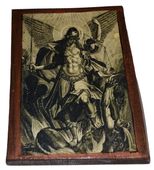 Współczesna ikona na drewnie o wymiarach ok.30 cm x 23 cm x 3 cm, . Ikona zabezpieczona lakierem i werniksem szelakowym w połączeniu własnej metody transferu na japońskim papierze umożliwia uzyskanie ciekawego efektu nanoszenia obrazu. Widoczne spękania, nierówności, wgłębienia, są zamierzone i celowe z tyłu zawieszka do powieszenia.Na życzenie dedykacja umieszczona na odwrocie reliefem wypukłym gratis.