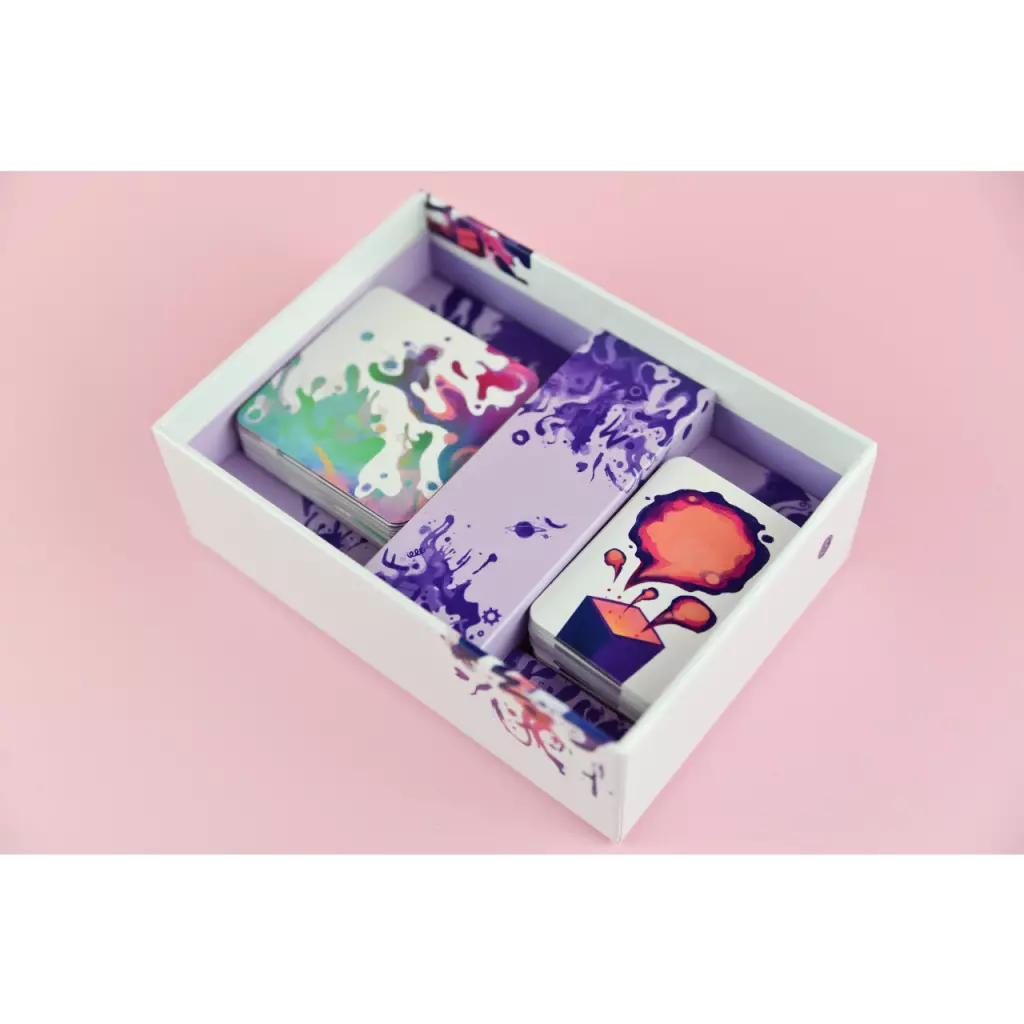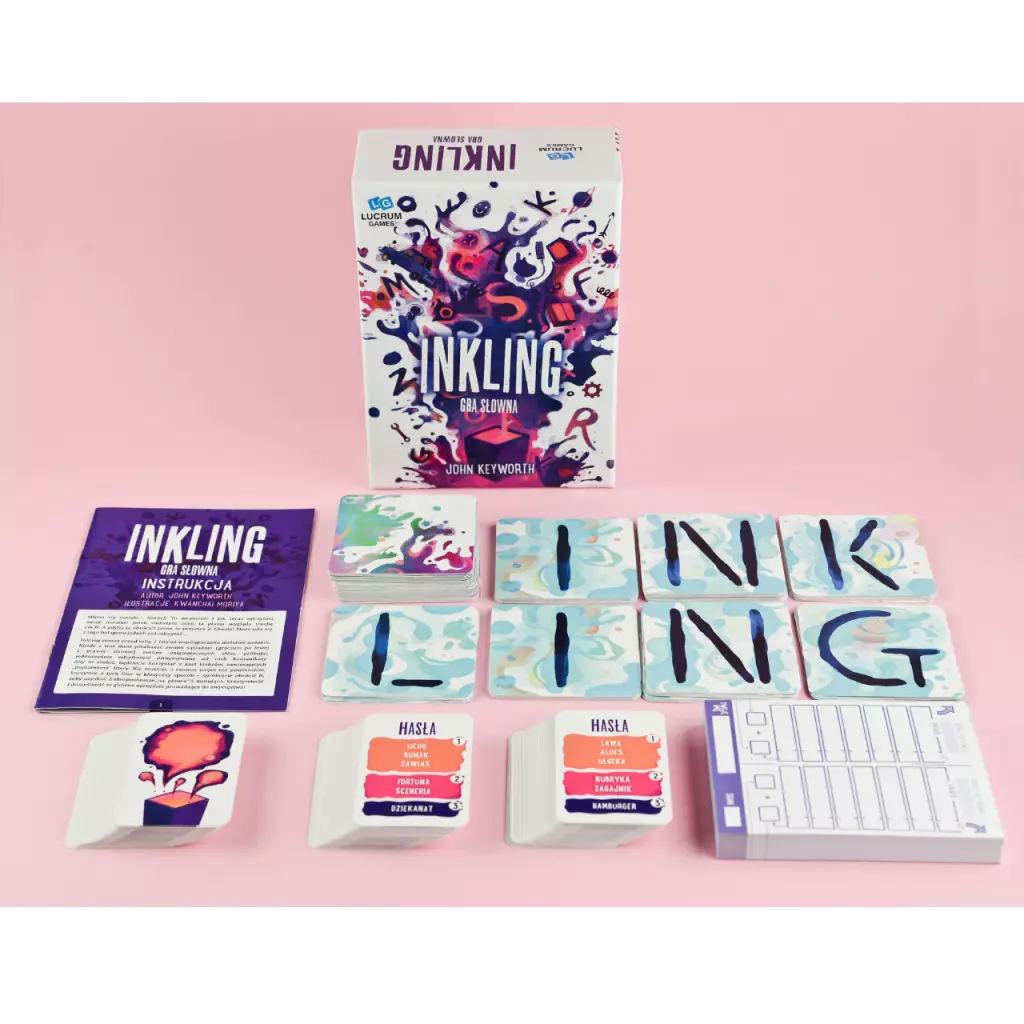 Kleksy z atramentu Mleko się rozlało… Gorzej! To atrament! I jak teraz odczytasz swoje notatki? Jeżeli zmrużysz oczy, ta plama wygląda trochę jak N. A gdyby ją obrócić? Jasne, to przecież Z! Chwila… Może jednak uda się odczytać co ś z tego bałaganu? „Inkling” stawia przed Tobą i Twymi współgraczami niełatwe zadanie. Każde z Was musi przekazać swoim sąsiadom –graczom po lewej i prawej stronie – zestaw sekretnych słów, próbując jednocześnie odszyfrować otrzymywane od nich komunikaty. Aby to zrobić, będziecie korzystać z kart kleksów zawierających „poplamione” litery. Nie musicie, a czasem wręcz nie powinniście, korzystać z tych liter w klasyczny sposób – spróbujcie obrócić N, żeby uzyskać Z, albo postawcie „na głowie” T, imitując L. Kreatywność i domyślność to główne narzędzia prowadzące do zwycięstwa! Zawartość opakowania: • 216 kart (w tym karty liter i karty haseł), • bloczek punktacji, • instrukcja.