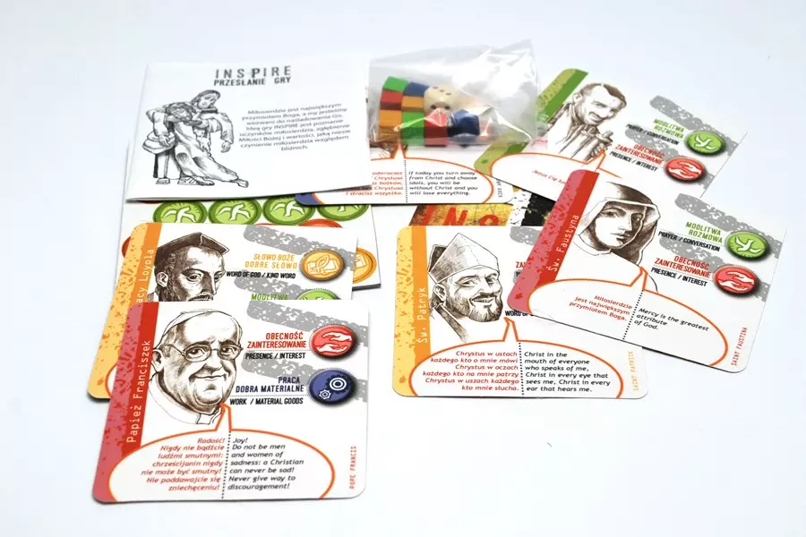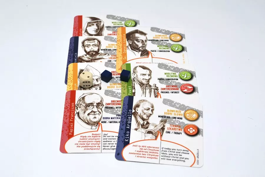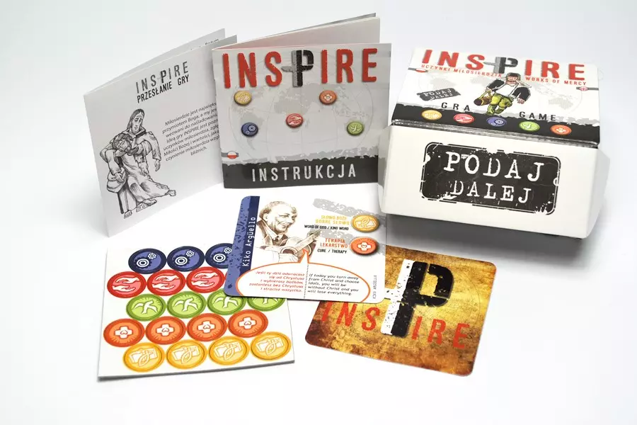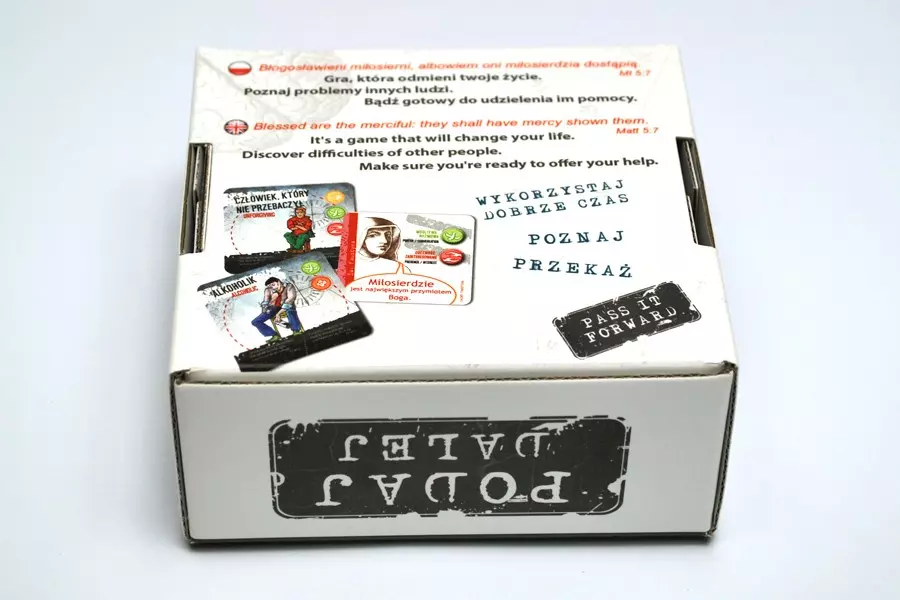 Gra odpowiada na współczesną potrzebę głoszenia idei miłosierdzia. Kto zagra już wie, że miłosierdzie zaczyna się od każdego z nas. Warto zagrać, aby zdać sobie sprawę z tego, że możemy zmieniać otaczającą nas rzeczywistość. Ideą gry jest poznanie uczynków miłosierdzia, zgłębienie Miłości Bożej i wartości, jaką niesie czynienie miłosierdzia względem bliźnich. Dzięki niej odkryjesz na nowo uczynki miłosierdzia względem ciała: głodnych nakarmić, spragnionych napoić, nagich przyodziać, przybyszów w dom przyjąć, więźniów pocieszać, chorych nawiedzać, umarłych pogrzebać. Nie zapominaj również o uczynkach miłosierdzia względem ducha: wątpiącym dobrze radzić, nieumiejętnych pouczać, grzeszących upominać, strapionych pocieszać, krzywdy cierpliwie znosić, urazy chętnie darować, modlić się za żywych i umarłych. Zawartość opakowania: 59 kart, 20 żetonów, 8 drewnianych znaczników, kostka do gry, instrukcja PL-EN, przesłanie gry.