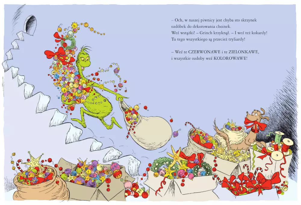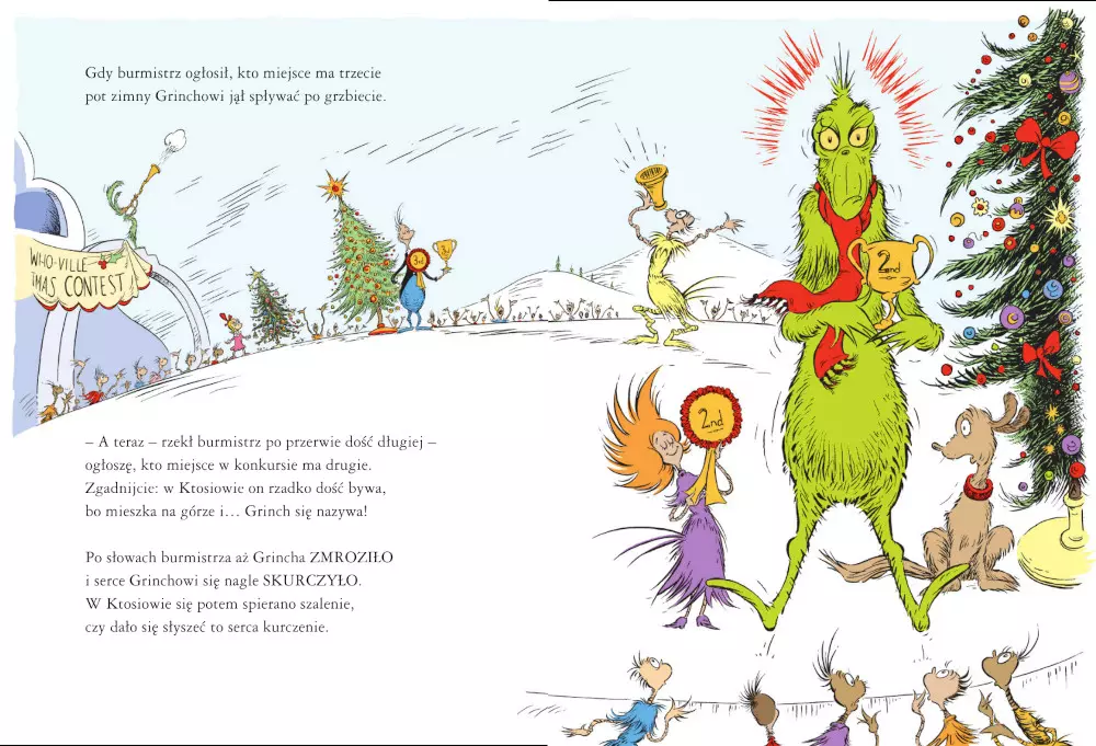 Kontynuacja ponadczasowego klasyka „Jak Grinch stracił święta”, tym razem napisana i zilustrowana przez innych autorów, ale z wiernością wobec oryginału. Jak wiemy Grinch pokochał Święta, więc kiedy dowiedział się o konkursie na naświąteczniejszą choinkę w Ktosiowie, wpadł na sprytny pomysł... Postanowił przygotować najwyższą, największą, najwspanialszą i najbardziej spektakularną choinkę, jaką kiedykolwiek widziano Ktosiowie! No i oczywiście wygrać! Jednak kiedy nie wszystko idzie po jego myśli, jest o krok od utraty świątecznego ducha! Czy dawny zrzędliwy Grinch powróci? A może pewien wyjątkowy Ktoś przypomni mu o prawdziwym znaczeniu Świąt?