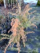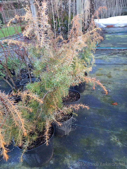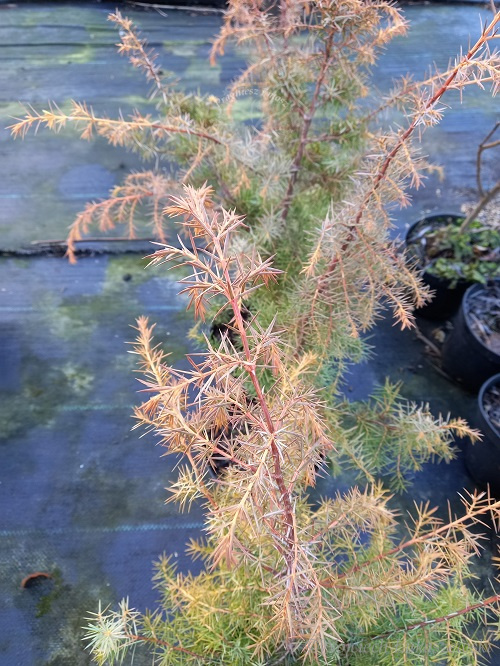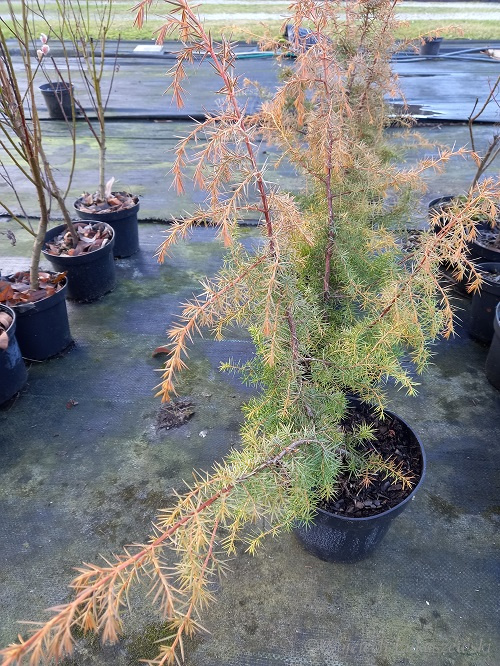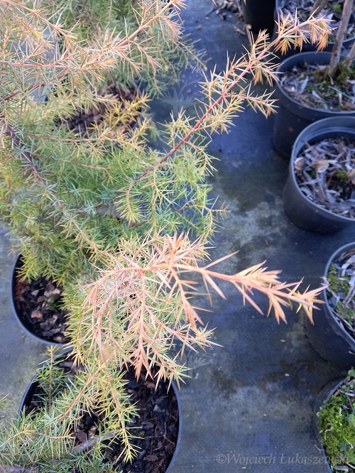 Pęd główny jest prosty, a boczne pędy lekko odchylone, skierowane ku ziemi. Jedną z wyjątkowych cech tej odmiany jest trzykrotna zmiana barwy igieł w ciągu roku: pozostają one zielone wiosną i latem, brązowieją jesienią, a zimą przybierają żółtopomarańczowy odcień.