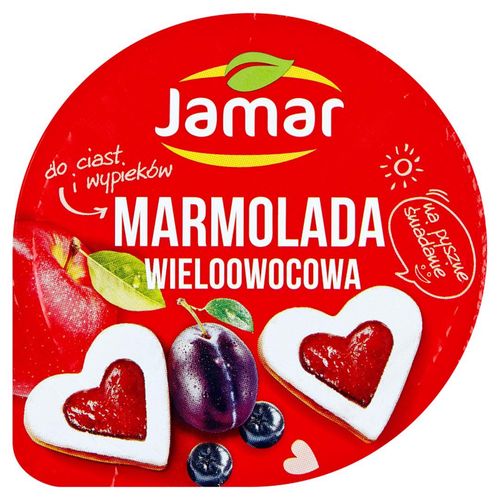 owoce mieszane (jabłka, aronie, czarne porzeczki, śliwki, truskawki);syrop glukozowo-fruktozowy;cukier;substancja żelująca: pektyny;regulator kwasowości: kwas cytrynowy;substancja konserwująca: sorbinian potasu;aromat;Sporządzono z 110 g owoców na 100 g produktu