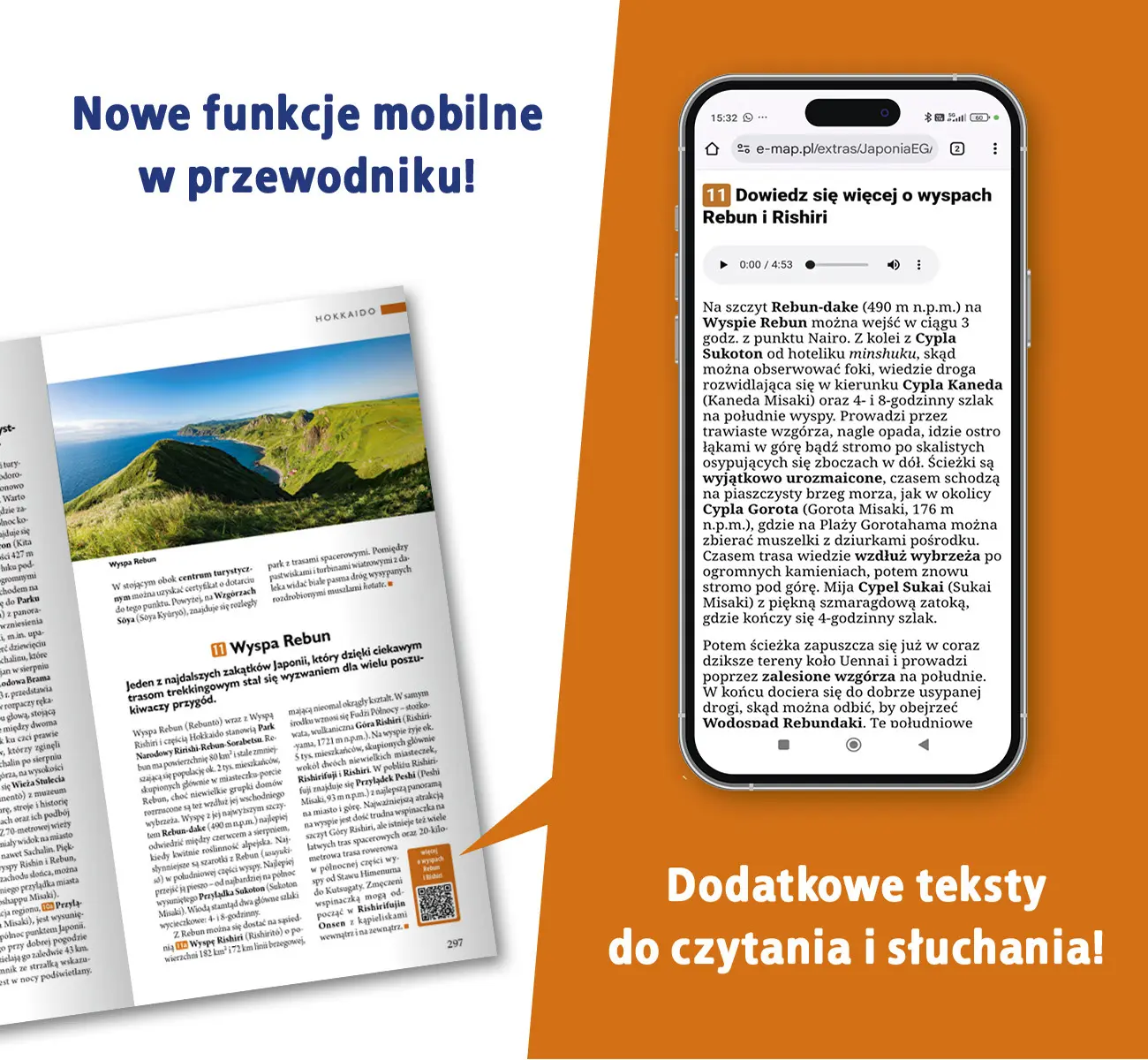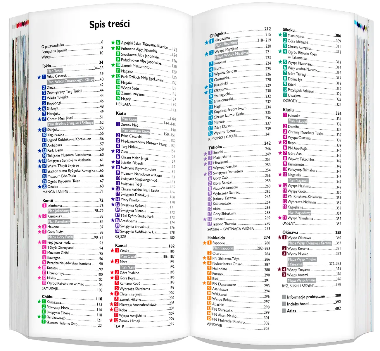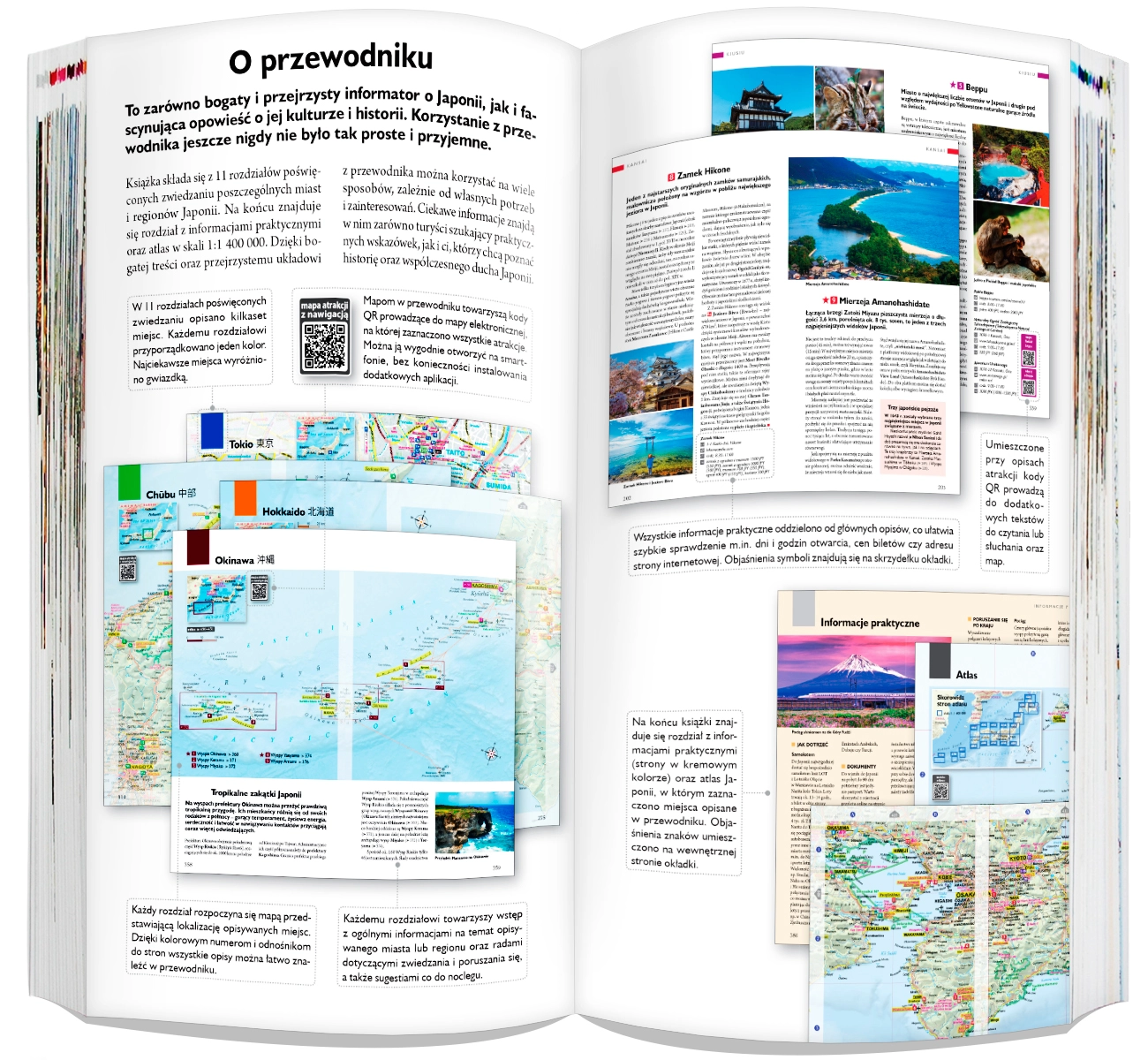 Święta Góra Fudżi, historia i nowoczesność Tokio i Kioto, bramy torii w Chramie Fushimi Inari Taisha i na Wyspie Miyajima. Kopuła Bomby Atomowej w Hiroszimie. Nara z Wielkim Buddą i oswojonymi jeleniami. Świątynie, chramy i pagody Nikkō i Kamakury oraz Zamek Himeji. Gaj Bambusowy w Arashiyamie i makaki w gorących źródłach. Szczyty i doliny Alp Japońskich. Wulkaniczne góry, malownicze wąwozy i najpiękniejsze japońskie ogrody. Herbata w towarzystwie gejszy, barwne kimona i samurajskie zbroje. Szintoistyczne chramy i buddyjskie świątynie. Podziwianie kwiatów wiśni i jesiennych liści. Onseny i widowiskowe festiwale. Manga i anime. Sekrety japońskiej kuchni: sake, sushi i sashimi. Aromatyczny ramen. Lokalne przysmaki na tradycyjnych targach i ulicznych straganach yatai. Przewodnik Japonia z serii 2w1 to zarówno bogaty i przejrzysty informator o kraju, jak i fascynująca opowieść o jego kulturze i historii. Nowa jakość wśród przewodników – wyjątkowe połączenie barwnych opisów i szczegółowych map: • mapy tras zwiedzania przedstawiające lokalizację wszystkich opisywanych miejsc, • mapa atrakcji z nawigacją dostępna na smartfonie, • bogata treść – historia i kultura, przyroda i tradycje, ciekawostki i anegdotki, • kody QR prowadzące do dodatkowych map i tekstów do czytania lub słuchania, • przydatne informacje praktyczne – dni i godziny otwarcia obiektów, adresy stron www, ceny biletów, transport publiczny, noclegi, • informacje o lokalnej kuchni i festiwalach, • przejrzysty układ graficzny umożliwiający łatwe wyszukiwanie informacji, • schemat komunikacji.