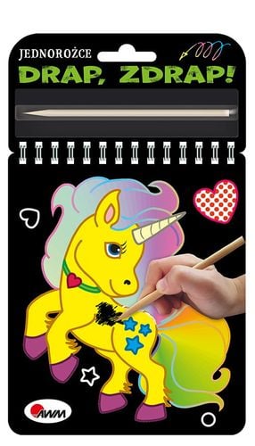 Książeczka zdrapywanka z rysikiem, dzięki któremu powstaną kolorowe obrazki z jednorożcami.
