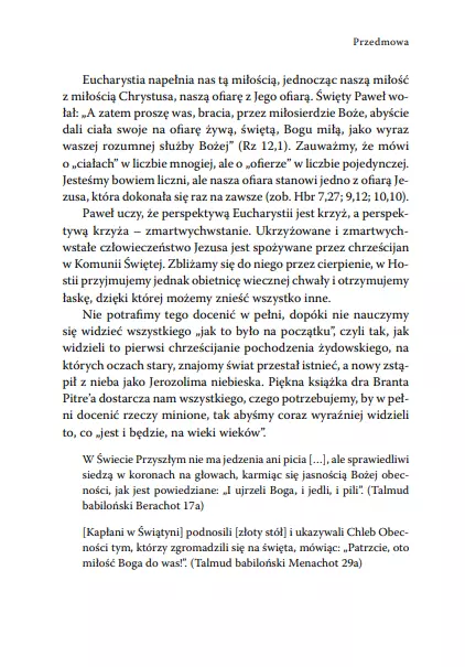 Jezus i żydowskie korzenie Eucharystii to świeże spojrzenie na Ostatnią Wieczerzę opisaną z perspektywy tradycji judaizmu. Brant Pitre dzięki swojej dogłębnej wiedzy biblijnej odpowiada na kluczowe pytania: Jak wyglądała żydowska Pascha w czasach Jezusa? Dlaczego Jezus ustanowił Eucharystię w czasie tego święta? I przede wszystkim: co miał na myśli Zbawiciel, mówiąc: „To jest Ciało moje... To jest Krew moja”? Aby odpowiedzieć na te pytania, autor przestudiował starożytne wierzenia żydowskie dotyczące Paschy Mesjasza, cudownej manny z nieba i tajemniczego Chleba Obecności. To trzy klucze do odkrycia pierwotnego, właściwego znaczenia słów Chrystusa, które wypowiedział podczas Ostatniej Wieczerzy. Autor wyjaśnia, w jaki sposób Jezus połączył ze sobą wydarzenia Wielkiego Czwartku ze swoją śmiercią w Wielki Piątek oraz zmartwychwstaniem w Niedzielę Wielkanocną. Przełomowa i inspirująca praca wyjaśniająca największą zagadkę chrześcijańskiej wiary: tajemnicę obecności Jezusa „przy łamaniu chleba”. Brant Pitre – profesor Pisma Świętego w Notre Dame Seminary w Nowym Orleanie, autor książek poświęconych Biblii i wierze, ceniony mówca. Poprzez swoje wykłady popularyzuje wiedzę na temat biblijnych korzeni chrześcijaństwa.