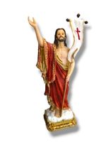 Figura przedstawia Chrystusa stojącego na obłoku w chwili Zmartwychwstania. Prawa dłoń uniesiona w geście błogosławieństwa, w lewej ręce chorągiew w formie krzyża – tradycyjny sztandar zwycięstwa nad śmiercią.