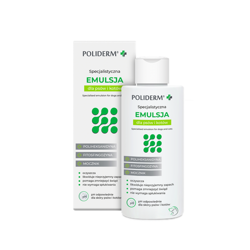 POLIDERM EMULSJA dla psów i kotów, która zapewni odpowiednią pielęgnację skóry i sierści, również w przypadku skłonności do łupieżu, dermatoz i stanów zapalnych tła grzybiczego. Poliderm Emulsja łagodzi podrażnienia, nawilża i wspomaga barierę ochronną skóry. Preparat przywraca równowagę mikrobiologiczną skóry, neutralizuje toksyny i redukuje świąd. W celu uzyskania najlepszych efektów zaleca się stosowanie produktów Poliderm naprzemiennie.
