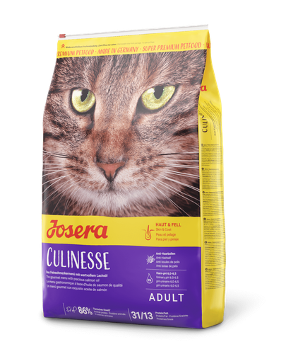 Sucha karma dla dorosłego kota Josera Culinesse 10kg to pokarm stworzony dla wyjątkowo wybrednych zwierząt. Receptura zawierająca aromatyczne mięso drobiowe i łososia jest nie tylko atrakcyjna smakowo, ale również bardzo korzystna dla zdrowia. Odpowiednio zbilansowane składniki poprawiają stan skóry i sierści, a także wspomagają system immunologiczny. Regularne spożywanie karmy pomaga usunąć kłaczki z żołądka Twojego kota. Sucha karma Josera Culinesse, posiadająca w swoim składzie łososia i mięso drobiowe, spełni oczekiwania twojego zwierzaka. Zastosowane w niej składniki pomagają dbać o skórę i sierść kotów jednocześnie ułatwiając usuwanie połkniętych włosów i przeciwdziałając powstawaniu kłaczków w ich żołądkach. Optymalna wartość pH zapobiega powstawaniu kamicy moczowej.