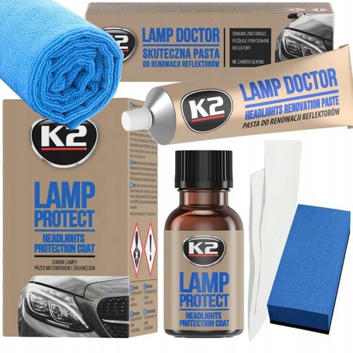 Zestaw zawiera również powłokę ochronną K2 Lamp Protect, która tworzy trwałą i w 100% przezroczystą warstwę zabezpieczającą przed szkodliwym działaniem promieni UV, żółknięciem, matowieniem oraz lekkimi zarysowaniami. Gwarantuje to utrzymanie doskonałego wyglądu reflektorów przez długi czas.