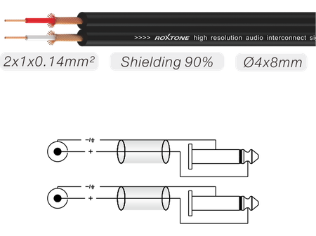 Dane techniczneZłącze 1-AWtyk Jack 6.3mm MonoZłącze 1-BWtyk Jack 6.3mm MonoZłącze 2-AWtyk RCAZłącze 2-BWtyk RCATemperatura pracy [°C]-20 - +70Pojemność między przewodem sygnałowym a ekranem na 1 m138 pFRezystancja przewodu na 1 m120 ΩRezystancja izolacji na 1 m70 mΩWspółczynnik ekranowania90%Dane fizyczneKolorCzarnyDługość kabla [m]1Średnica zewnętrzna kabla [mm]4 x 8AWG26Przewód wewnętrzny [mm²]2 x 1 x 0.14Budowa przewodu wewnętrznego [mm]18 x 0.10Materiał przewoduMiedźEkranowanieMiedziany ekran spiralnyMateriał ekranuMiedźMateriał powłoki zewnętrznejPVC